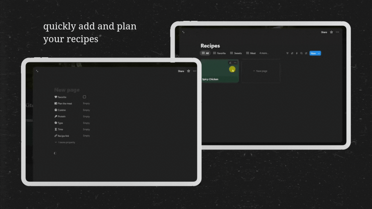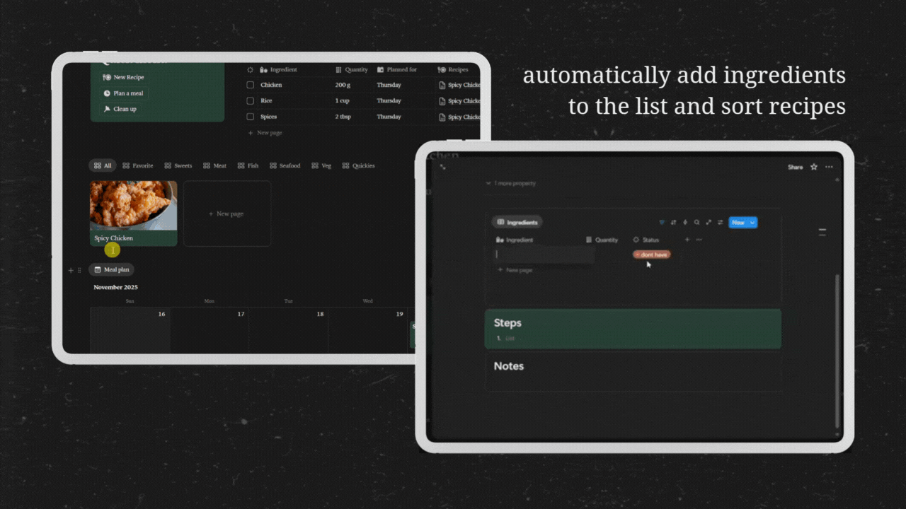 Smart Kitchen Planner is a Notion meal planner template with automatic grocery list, recipe database, and meal prep organization. Plan weekly meals, monthly menus, and generate shopping lists automatically. Organize your recipes with custom collections like favorites and other categories. Perfect for meal planning, grocery shopping, recipe management, and kitchen organization. Simple meal prep system for busy home cooks who want an all-in-one cooking planner and recipe organizer in Notion.